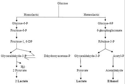 Послідовність реакцій при гомоферментативному (зліва) та гетероферментативному (справа) молочнокислому бродінні.